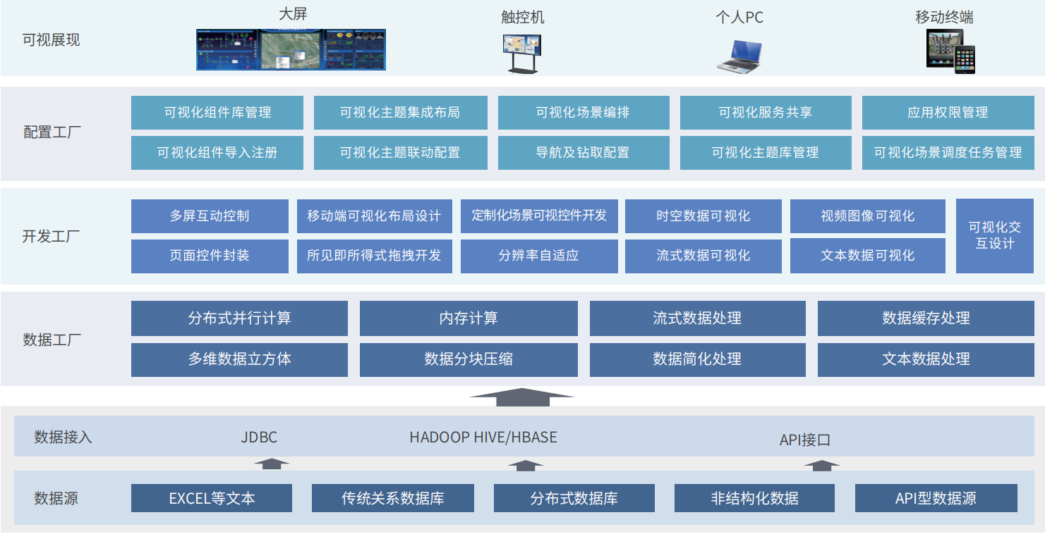 针对各行业的各种展现场景进行快速可视化的套装软件,以简洁式操作和配置为主,可针对突发业务 展现需求进行及时构建和响应。平台的使用无需专业技术人员介入,可完全面向业务人员,通过简单的 自助拖拽实现展现效果的呈现,便于以业务需求为主导的方式进行业务数据的自主探索。该平台提供丰富的可视化展现方式,支持多尺寸终端的自动适配,以最大程度降低使用人员的技术门槛,解放业务人 员专心解决业务问题、探索业务规律。