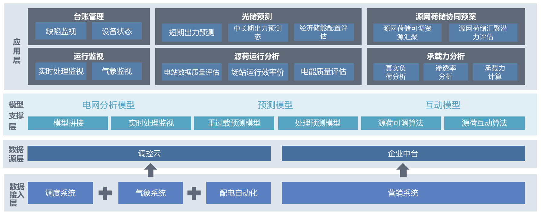 重点解决分布式能源多源数据融合和分析力度有限的业务痛点,以新能源采集为数据基础,充分考虑分布式能源接入配网影响因素,构建分布式能源接入电网引导合理布局、装机规模规划与协同应用分析应用规划,实现新型电力系统下配网供电能力辅助应用、分布式能源全景可视化、承载力分析、风险识别、光伏出力预测、经济储能评估、消纳能力评估、源网荷储协同互动等应用场景。