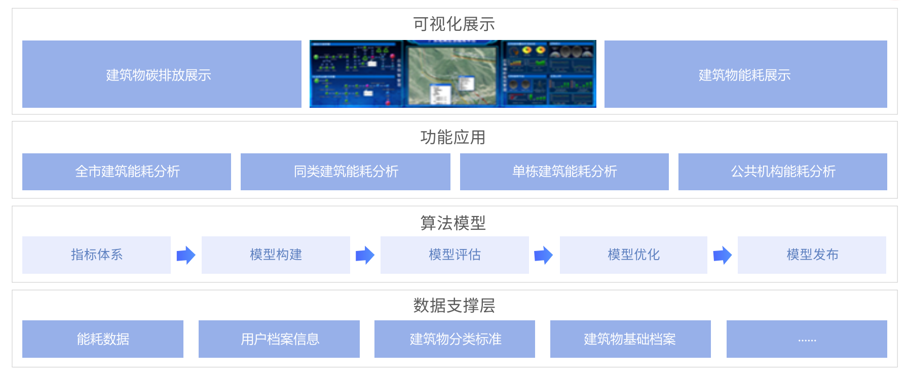 基于大数据分析与可视化技术的应用,实现对城市能耗情况进行分析与可视化监控,帮助各级管理单位从建筑物的视角,掌握城市整体的能耗水平与不同维度的能耗结构。