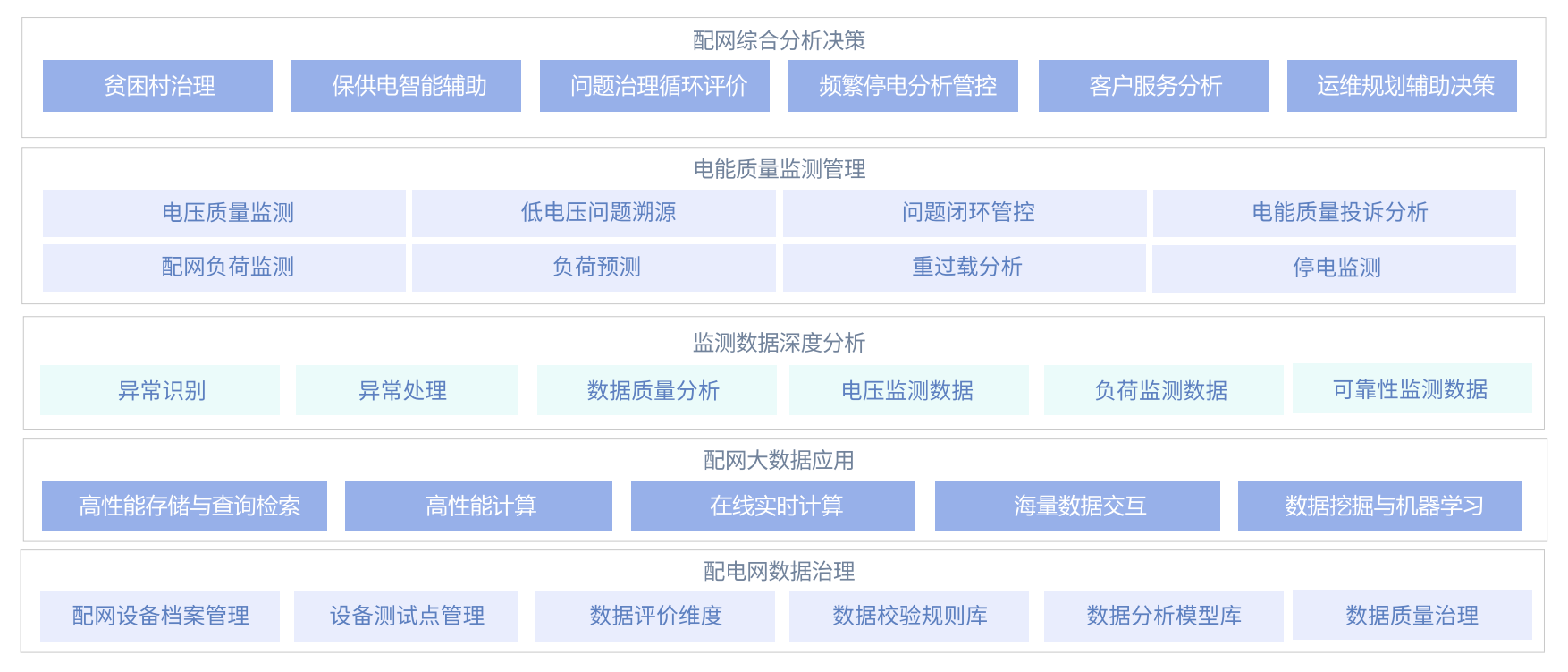 系统主要聚焦于配电网电能质量管理,以大数据、人工智能、物联网、云等技术为驱动,充分利用配电网数据信息,基于智能电网和物联网建设成果,通过电网信息融合、大数据挖掘分析、人工智能及交互 式可视化技术,实现在线开展配网电能质量监测和治理,对电能质量问题进行监控、分析、溯源、治理、 评价和决策应用,同时结合网架可靠性评价体系,为配电网规划改造、运维及应急保供电提供辅助决策 支撑,从而提升供电可靠性和客户满意度。
