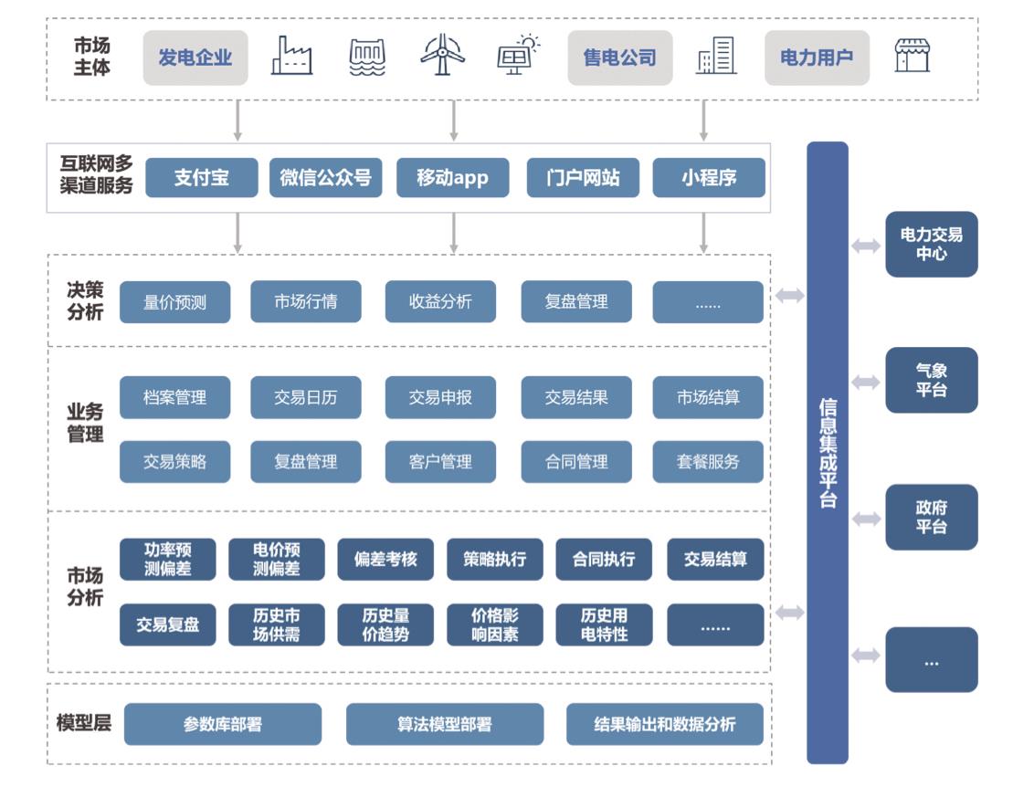 基于一体化设计理念、电力交易规则,从顶层统一设计和规划,构建电力交易灵活配置模式,实现交易品种、交易方案、结算方案等灵活配置,减少因政策及交易规则变化带来的各种成本,助力企业有序、安全、合规的开展电力交易业务。