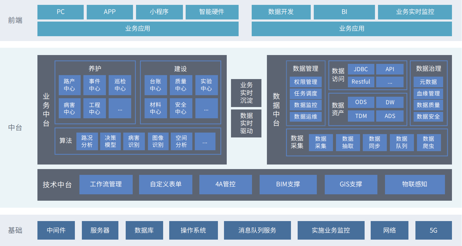 智慧公路数字中台以“业务+数据”双中台为核心技术,面向公路管理部门及运营企业打造一站式中台解决方案。涵盖业务中台、数据中台、技术中台等多个领域,旨在通过新一代数字化、智能化技术,输出本地化中台产品,助力公路管理部门及运营企业构建公路产业生态圈,帮助政府、企业实现高质量的数字化转型。