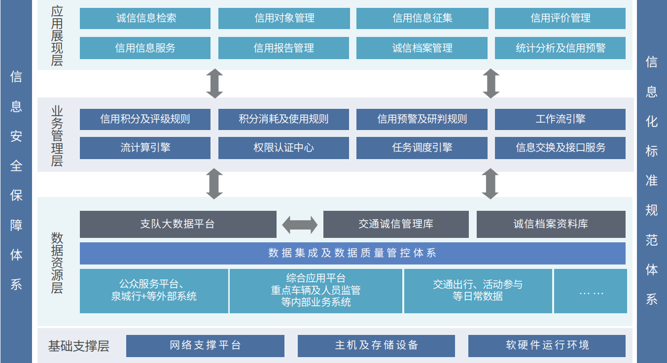 交通管理诚信平台以自然人、车辆、法人等征信基本对象为核心, 构建360度诚信对象模型。抽取各类相关信用信息到相应对象模型,将交通违法信息及不文明交通行为等纳入交通诚信档案,形成一种“诚信受益、失信受戒”的交通安全管理机制。可为外部信用监管相关部门提供基础数据支撑,为响应全国社会信用体系建设提供保障。平台主要包括交通诚信画像(诚信信息检索引擎)、信用对象管理、信用信息征集、信用评价管理、信用信息服务、信用报告管理、诚信档案管理、统计分析及交通诚信预警、组织及用户管理等。
